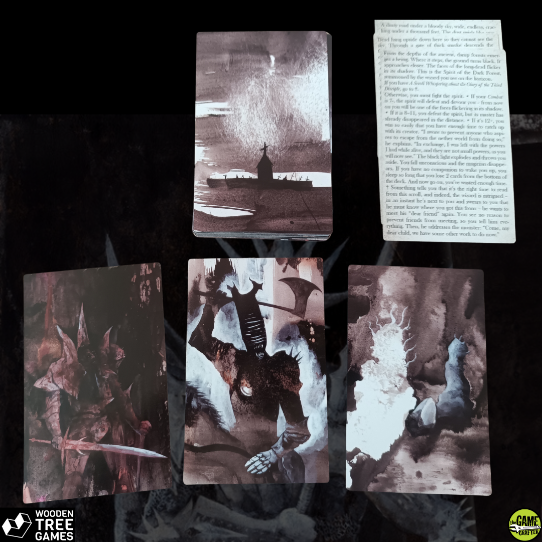A single-player card game where you take on the role of the knight Mordred, who embarks on a journey through the underworld, encountering all manner of lost souls and facing various temptations as he seeks to atone for his past and gain access to the higher realms of the afterlife. Will you manage to forge your path to the light, or will you plunge even deeper into darkness? The game is structured as a card-based gamebook with roguelite gameplay elements. It includes 60 hand-painted ink illustrations.