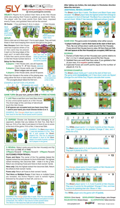 Players try to protect their chickens in the henhouse while simultaneously using their foxes to eat their opponents' chickens. The player with the most points from safe chickens, exposed enemy foxes, and eaten chickens is the winner!