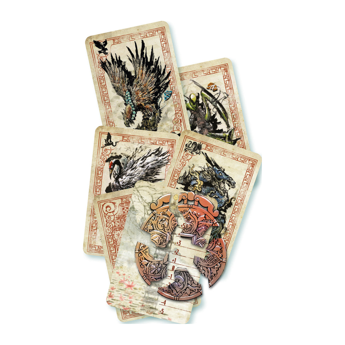 In Tinco, there are no turns: everyone plays simultaneously. To assemble a set of five cards that show the same element—a specific animal or color—players exchange cards. These cards are never shown; only the number is announced. Once a player completes their Tinco (a set of five cards), they must quickly grab one of the medallion fragments lying on the table. The other players must try to collect more fragments to avoid losing positions in the Tower. After a series of rounds, the player with the highest position in the Tower of Harmony wins.