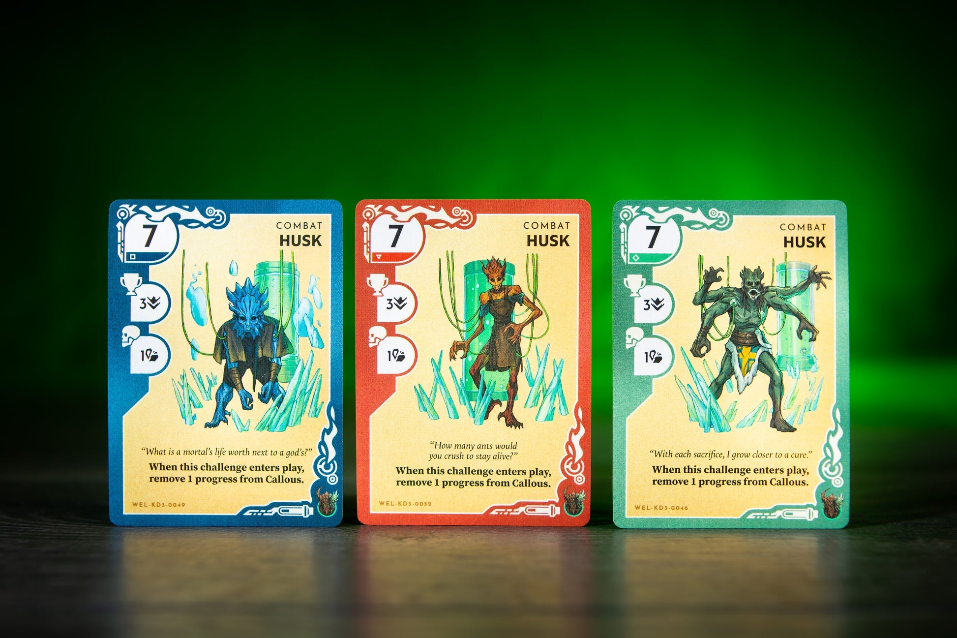 Wenn du eine Herausforderung meisterst, erhältst du eine Belohnung, z. B. die Wiederherstellung deiner Gesundheit oder das Vorankommen im Brunnen, was durch das Ablegen verdeckter Herausforderungskarten dargestellt wird. Sobald du den Grund des Brunnens erreicht hast, stehst du Callous selbst gegenüber. Alle Sucher teilen sich einen Gesundheitspool, und wenn dieser Pool auf Null sinkt, seid ihr besiegt. Dies ist ein Spiel, das Teamwork erfordert.