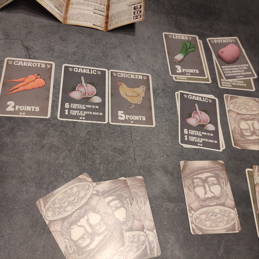 Du und deine Mitspieler schlüpft in die Rolle eines Bauern, der Zutaten aus dem Garten sammelt, um einen Eintopf zu kochen. Es gibt sechs Schädlinge, die deinen Eintopf vor dir essen wollen. Ziehe eine Karte und füge sie deinem Eintopf hinzu oder füttere einige der Schädlinge, um deinen Topf zu schützen. Warte nicht zu lange, sonst könnten deine Mitbauern deinen Eintopf essen.