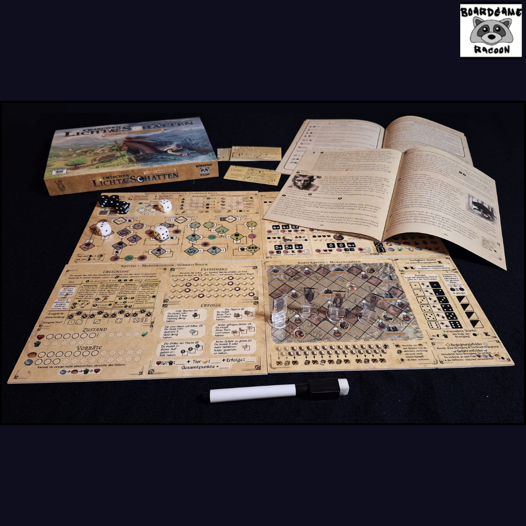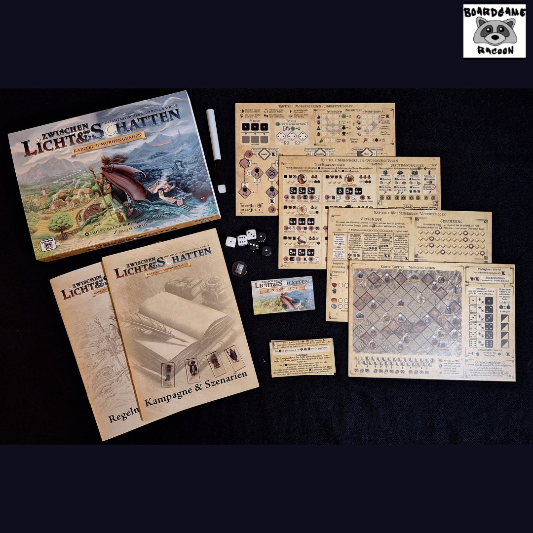 Zwischen Licht und Schatten ist ein Solo Spiel voller Abenteuer und neuartigen Mechaniken, welche dich zum Grübeln bringen werden. Erlebe in diesem ersten Kapitel den Begin der Geschichte um die Rückkehr des Schattens. Dabei spielst du in unterschiedlichen Szenarien verschiedene Charaktere und musst dich immer neuen Herausforderungen stellen.